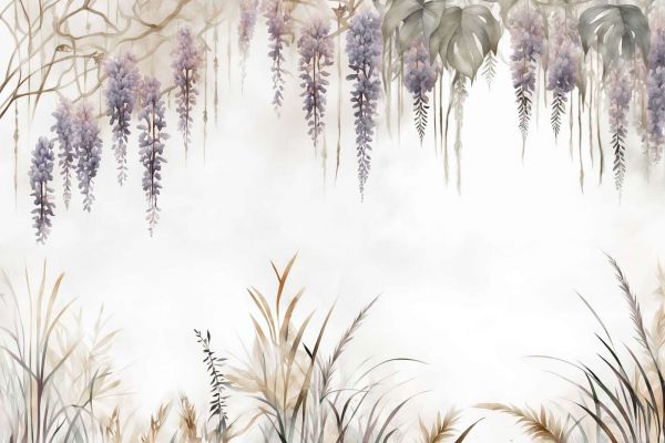 This refined design brings an enchanting combination of botanical beauty and serene elegance. The hanging wisteria flowers, painted in soft lilac and gray tones, seem to descend like a natural veil, framed by gently waving wild grass. The warm earth tones and subtle misty background give the whole a calm and harmonious appearance. This design fits perfectly in interiors with a romantic, bohemian, or Japandi style. The neutral colors make it versatile and easy to combine with natural materials such as wood, linen, and rattan. In a modern interior, it offers a subtle botanical touch, while in a classic setting, it adds a sense of timeless elegance. Thanks to its dreamy and soothing appearance, this design is ideal for serene spaces such as a bedroom, living room, or reading nook. In a wellness area or a boutique hotel, this pattern can contribute to a calming and refined ambiance. The design looks beautiful in combination with soft textures like wool and velvet, while golden accents add an extra touch of luxury. With its delicate wisteria flowers, swaying grass, and soft watercolor tones, this design brings a sense of tranquility and natural beauty to any space. Perfect for those seeking a stylish yet subtle botanical addition to their interior.