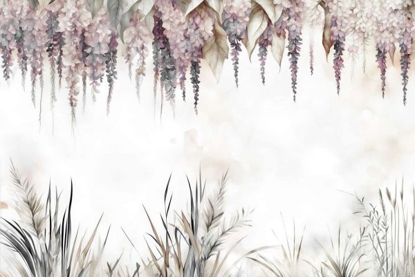 A refined design in which hanging wisteria flowers gently blend into a landscape of graceful wild grasses. The subtle shades of lilac, sepia, and gray in watercolor style create a dreamy and calming appearance. The delicate color gradients and soft light give this design an elegant, natural atmosphere.
