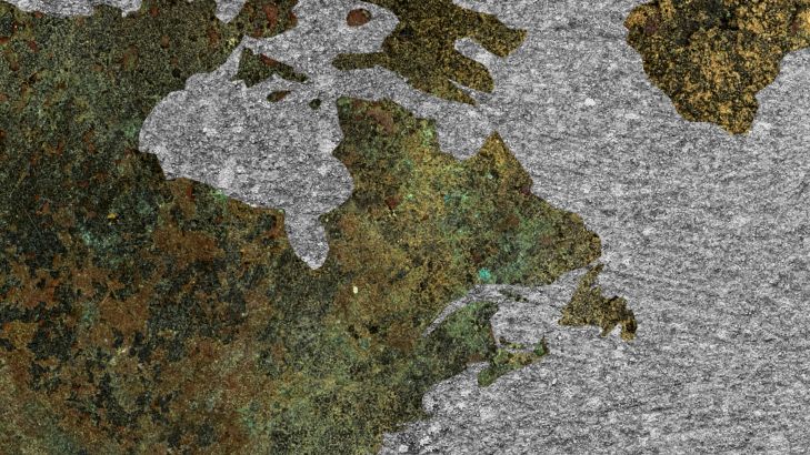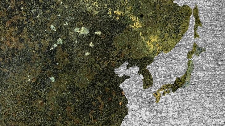 Green world map on grey concrete. The concrete gives this wallpaper an industrial look.