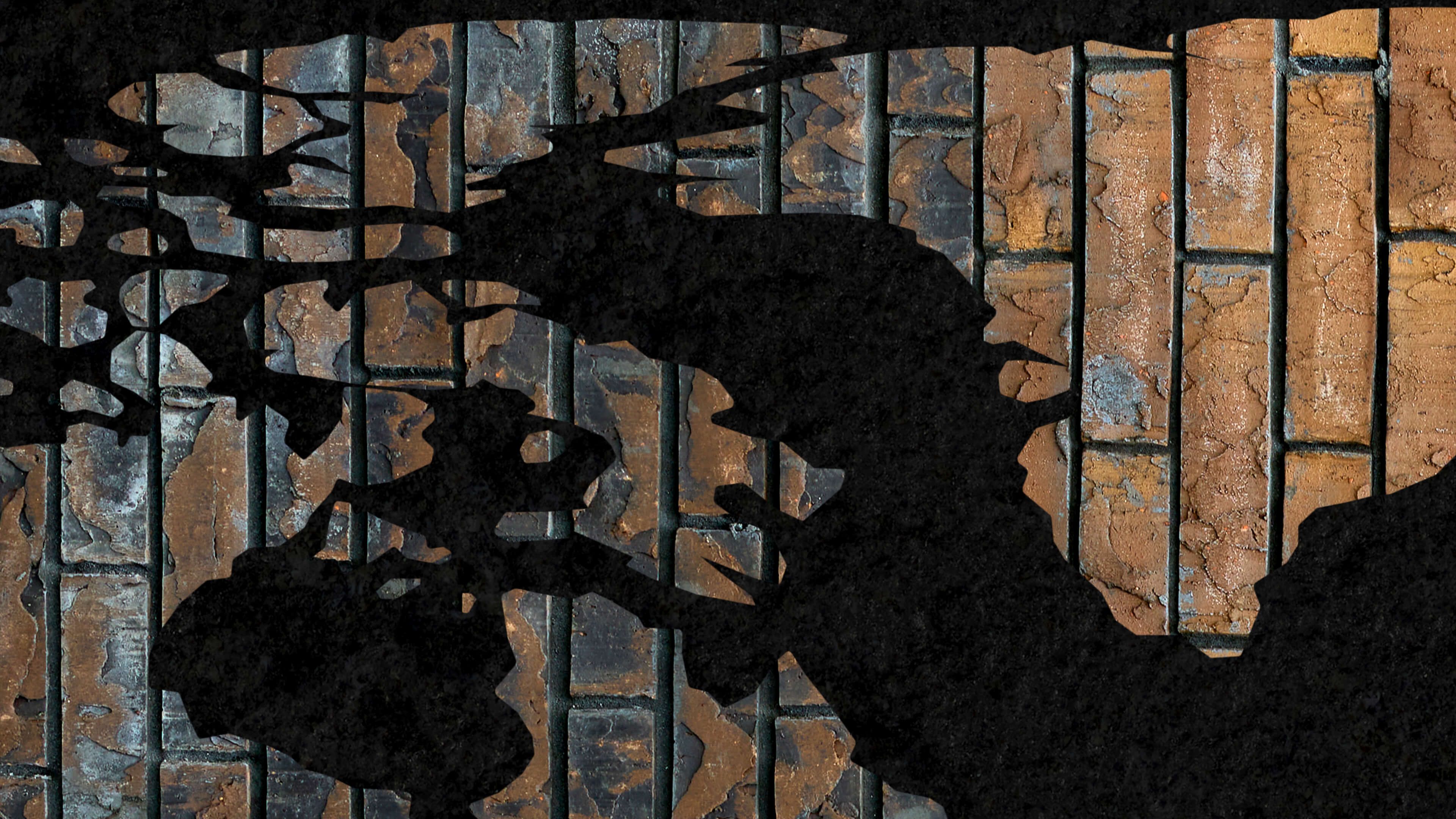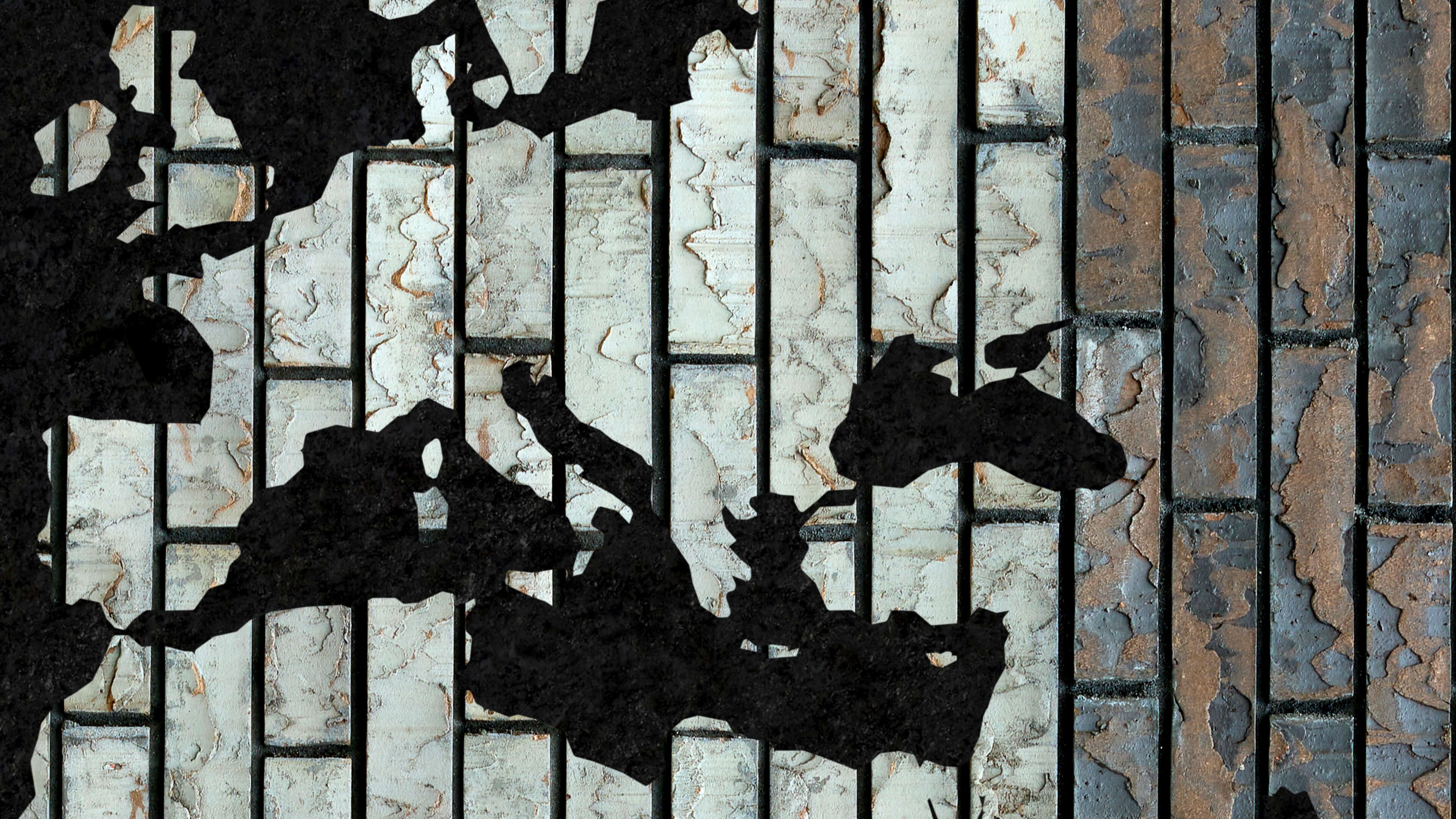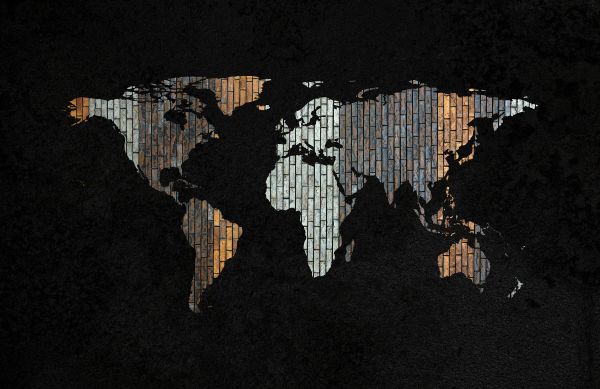 World map with vertical coloured bricks. The black background makes the world map stand out.